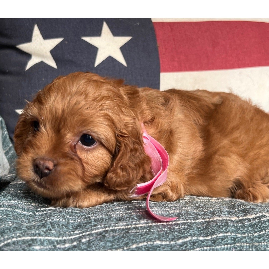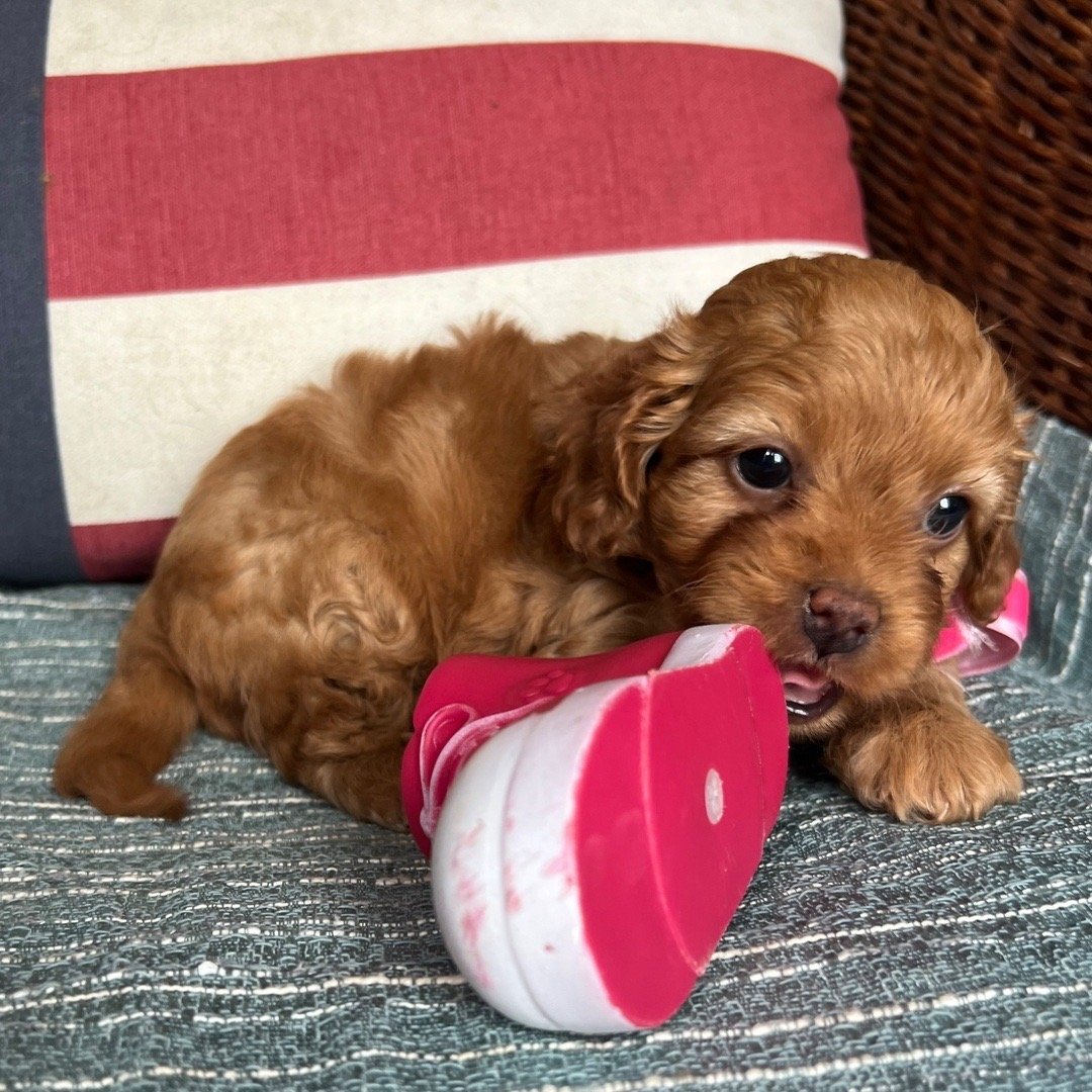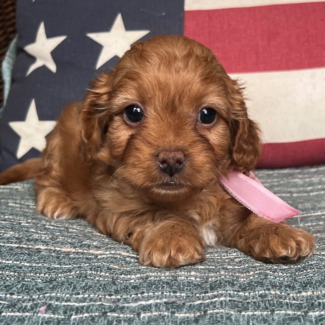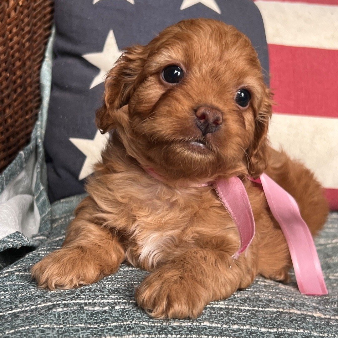 Hi, I’m Daisee! I’m a 10-week-old female Cavapoo with a beautiful red coat, born on May 18, which makes me a Taurus pup. I am ready now to plan my trip to my forever family. Once I reach my adult size, I’m expected to weigh between 10–14 lbs. I’m ACHC registered. My little paws are ready to make big memories with you.